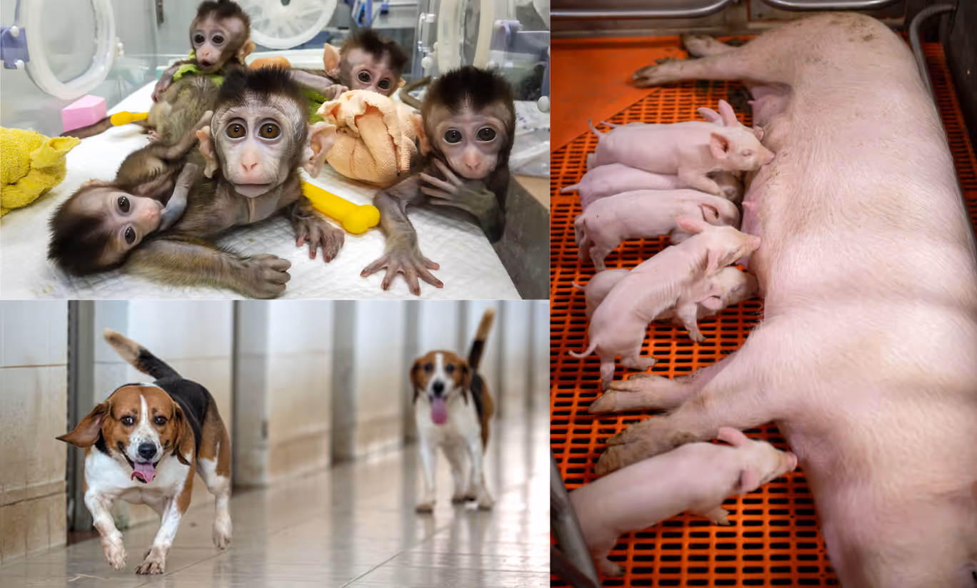 L’Institut Pasteur de Montevideo a par exemple produit des moutons sourds afin de tester des thérapies géniques en 2020[25]. Début 2019, un Institut chinois a cloné un singe génétiquement modifié avec la technologie CRISPR. Afin d’étudier les troubles neurodégénératifs chez l’humain, ils ont inactivé le gène responsable de la régulation du sommeil[26]. Ces singes souffrent donc de troubles du comportement, de manque de sommeil et présentent des symptômes psychotiques (peur et anxiété.) Toujours en Chine et dès 2015, l’Institut pharmaceutique de Guangzhou — qui se targue sur son site web de produire des milliers de Beagles d’expérimentation — a modifié des chiens avec CRISPR pour les rendre deux fois plus musclés, là encore à des fins de recherche thérapeutiques. Évidemment, indique l’un des chercheurs, ces recherches pourraient aussi être utiles pour la chasse, la police ou l’armée[27]. La chercheuse américaine Irina Polejaeva et son équipe ont quant à eux modifié des moutons pour qu’ils soient affectés de maladies imitant des maladies génétiques humaines, et ont transplanté des chromosomes artificiels dans des chèvres pour qu'elles produisent des anticorps humains[28]. Dernier exemple, les entreprises e-Genesis et Revivicor travaillent à modifier génétiquement des porcs avec CRISPR afin d’améliorer les xénogreffes d’organes de porc vers l’humain, ce qui pourrait faire de ces porcs des « banques d’organes sur pattes[29] ». Dans un documentaire de juillet 2023, un biologiste fait preuve d’une logique imparable : « ces porcs qui nous fournissent de la viande et du bacon pour le petit-déjeuner, pourraient aussi nous fournir des organes et sauver des vies[30]. » En effet, pourquoi jeter les organes de ces animaux qui pourraient par ailleurs être utiles, s’ils sont de toute façon élevés pour être mangés ? Ainsi, les « porcons » de la trilogie dystopique de Margaret Atwood — Le dernier homme (2005), Le temps du déluge (2012), Maddaddam (2014) — deviennent réalité. Dans ce monde post-apocalyptique où une peste créée par les humains a ravagé la Terre, des cochons génétiquement modifiés pour fournir des organes aux riches, appelés « porcons », chassent les derniers humains survivants.