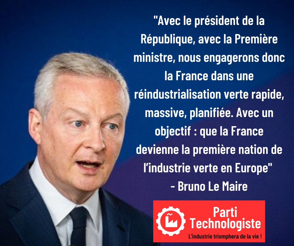 “With the President of the Republic, with the Prime Minister, we will therefore engage France in rapid, massive and planned green reindustrialization. With one objective: for France to become the first green industry nation in Europe[47] ”