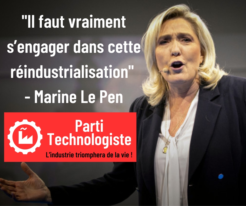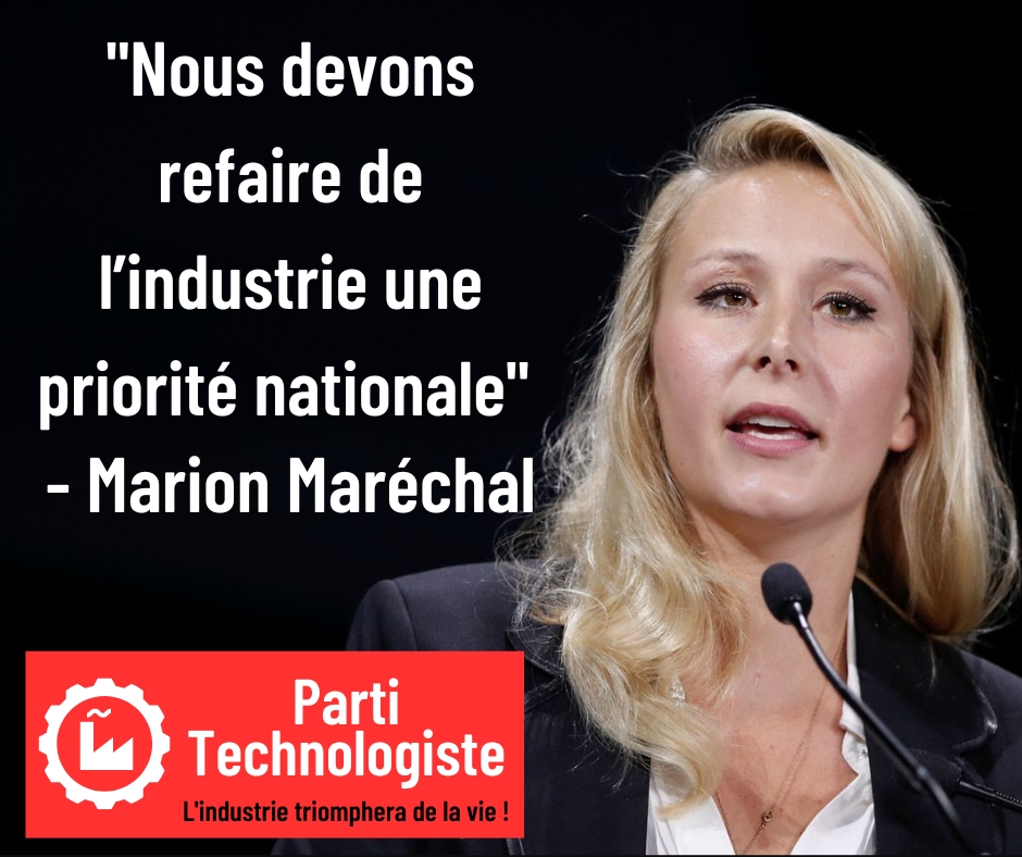 Niece of Marine Le Pen, an activist with the National Front since 2008, elected deputy in 2012, vice-president of the Reconquest party, Marion Maréchal advocates the same thing as all her technologist colleagues. Industry Über alles ! In an op-ed published in L'Opinion, she's lying, like all the technocratic mafia. It presents industrial relocation and the Made in France as essential to “meet environmental challenges.” The strategic state must take the lead in “establishing a clear, simple, stable fiscal, regulatory and educational environment.”[59].”