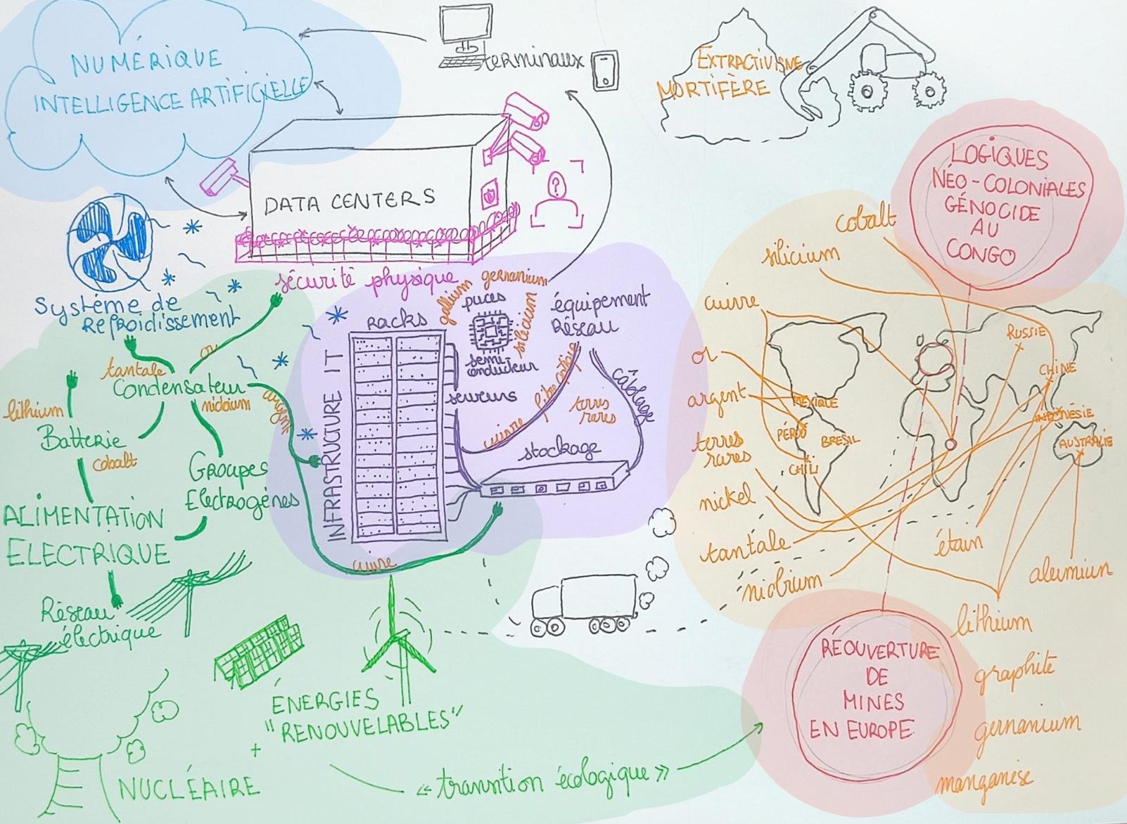 Et les besoins considérables des data centers en « énergie décarbonée » (entendre : en électricité) requièrent la réouverture de centrales nucléaires[8] et le développement des énergies renouvelables, toutes hautement gourmandes en métaux.