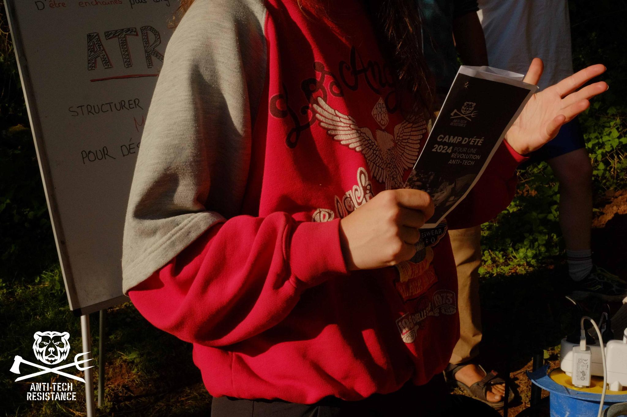 Pendant une semaine, le camp d’été fait office de terrain de formation théorique et pratique en vue de mener la révolution anti-tech. Ce camp permet aussi aux camarades – nationaux et internationaux – de se rencontrer et de renforcer les liens humains, chose indispensable avec l’éloignement géographique. La cadence est intense, et le contenu galvanisant.